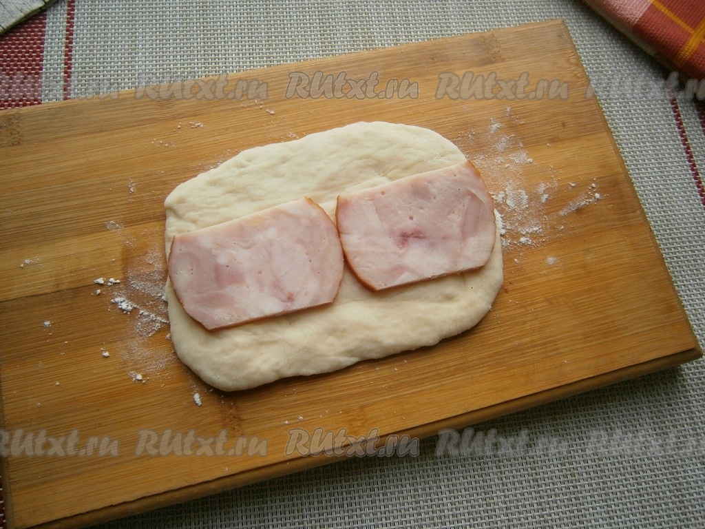 Для формовки каждого пирожка нам из одного кусочка теста нужно раскатать прямоугольник размером около 12х8 см и из скатанного шарика теста лепёшку диаметром около 13-14 см. Итак, на раскатанный прямоугольник теста выложить по середине один (или два) ломтика ветчины на всю длину.