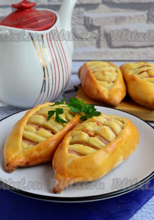 Спешу поделиться с вами замечательным рецептом пирожков, приготовленных с ветчиной и сыром из дрожжевого теста. Я придала выпечке невероятно красивую и интересную форму, которую увидела в Интернете. Сами пирожки получаются аккуратненькими, очень вкусными, с сочной начинкой из ветчины и расплавленным сыром внутри. Подавать эту выпечку лучше всего в тёплом виде, дополнив кетчупом или другим подобным соусом. Остывшие пирожки можно взять с собой на работу или дать ребёнку в школу. Обязательно приготовьте эту выпечку, она приведёт в восторг ваших родных и близких! Из данного количества продуктов получится 6 довольно больших пирожков.