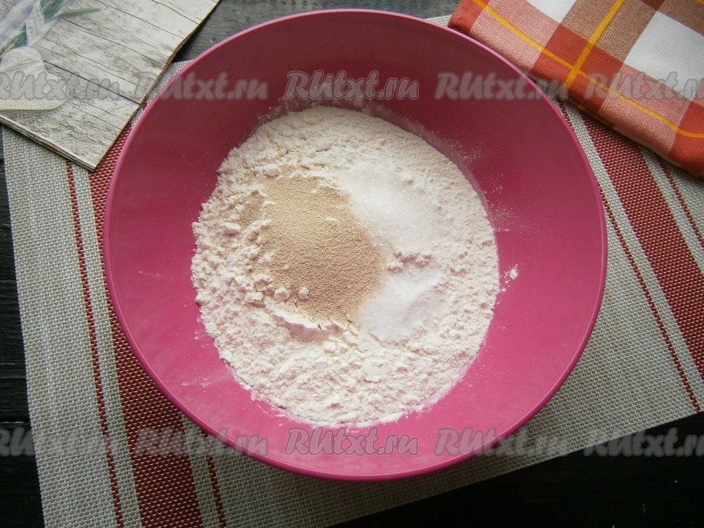 Просеять в миску муку, добавить сухие дрожжи, сахар и соль, перемешать.