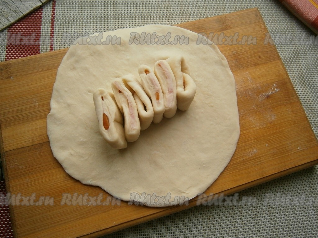 В середину предварительно раскатанной лепёшки диаметром 13-14 см расположить 6 кусочков теста с ветчиной, стоящих на ребре.