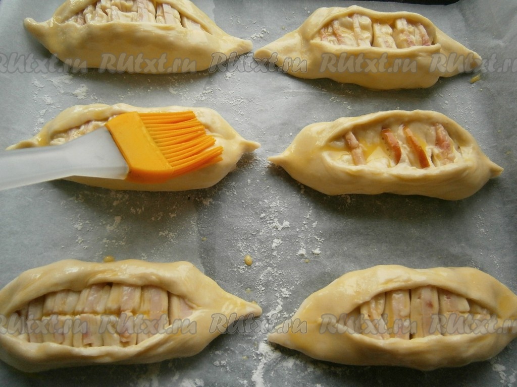 Яичный желток хорошенько смешать с водой и смазать этой смесью пирожки с ветчиной и сыром.