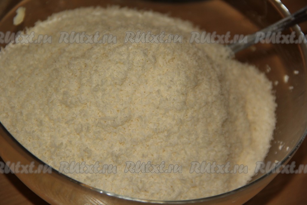 Переложить творожную массу в миску и добавить кокосовую стружку.