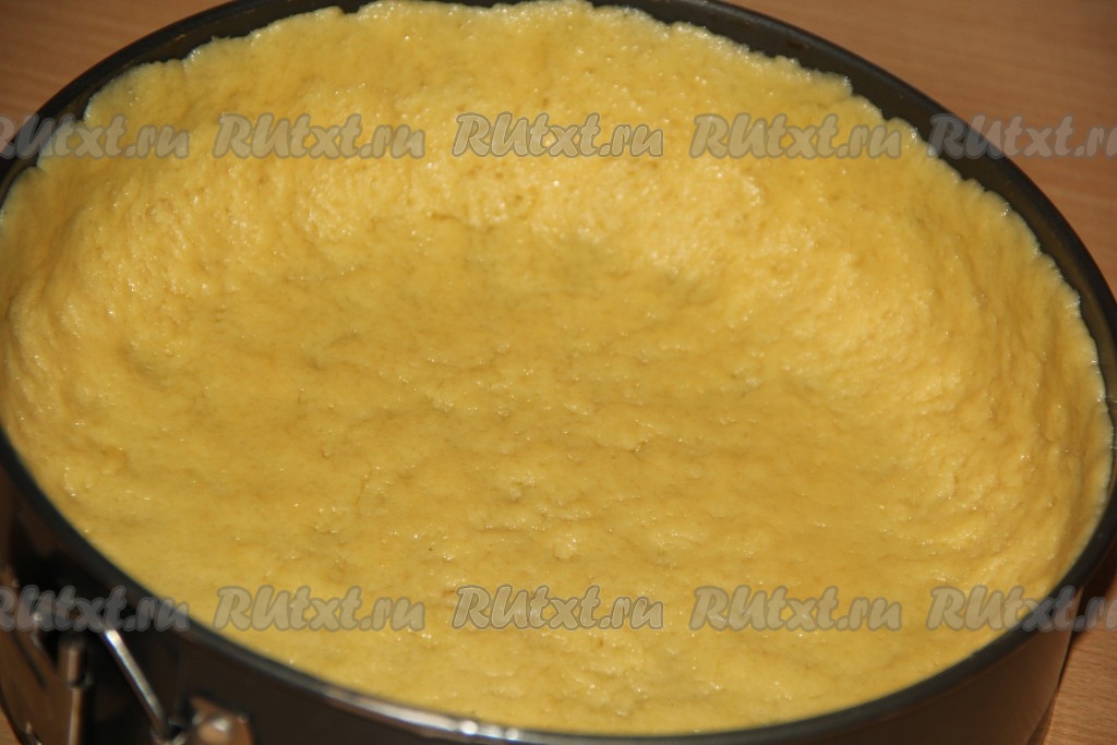 В форму для выпечки (лучше разъёмную) выложить тесто и равномерно распределить, формируя высокий бортик. Я использовала форму диаметром 22 см. Поставить форму с тестом в холодильник на 20 минут.