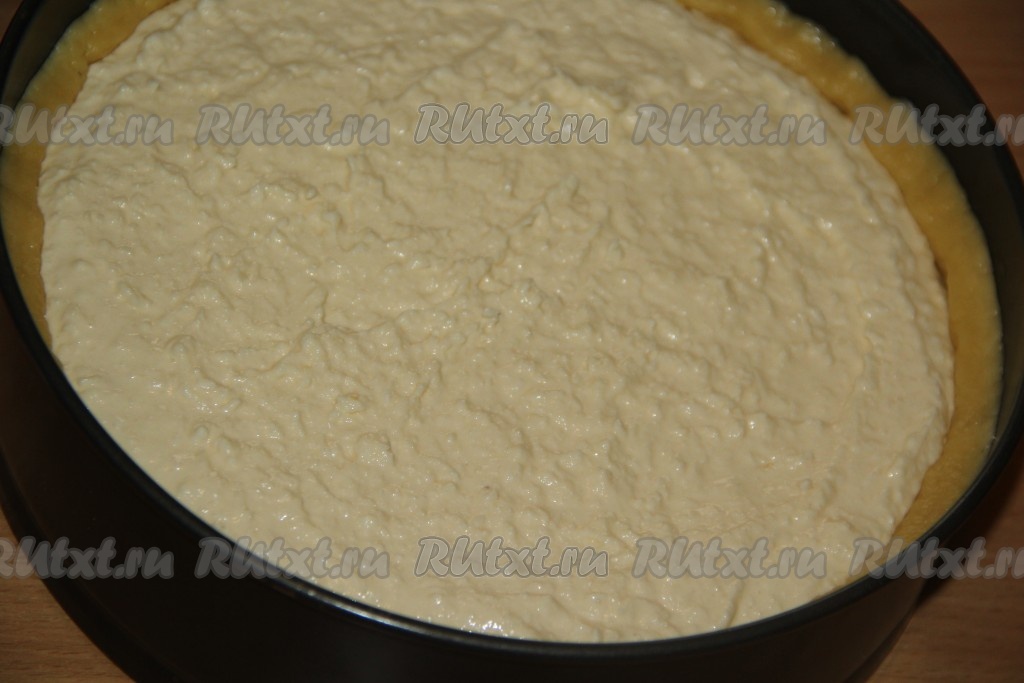 Перемешать творожную массу и выложить её в форму поверх теста, разровнять. Поставить форму в разогретую духовку.