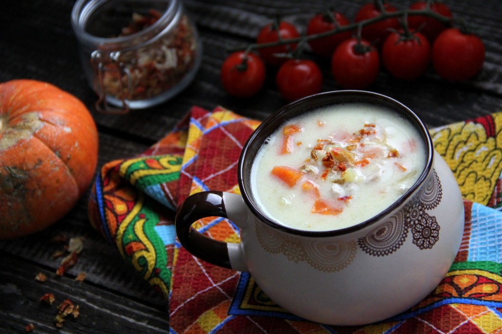Рецепт этого блюда взяла в кулинарной книге. Вроде бы всё просто, но добавление муки и сметаны делает текстуру куриного супа очень нежной и бархатистой, придаёт приятную сливочную нотку. А благодаря толчёному картофелю супчик получается густым и сытным. Всем советую приготовить суп по этому рецепту и насладиться его прекрасным вкусом!