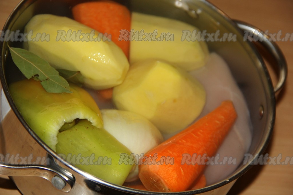 В кастрюлю выложить куриное филе. Картофель, лук и морковь очистить, а затем целиком (не нарезая на части) выложить в кастрюлю. Болгарский перец вымыть, очистить от семян, разрезать на две половинки и тоже выложить в кастрюлю. Влить, примерно, 2 литра воды и добавить лавровый лист. Поставить кастрюлю на огонь и довести до кипения. Снять пенку, убавить огонь и варить 30 минут.