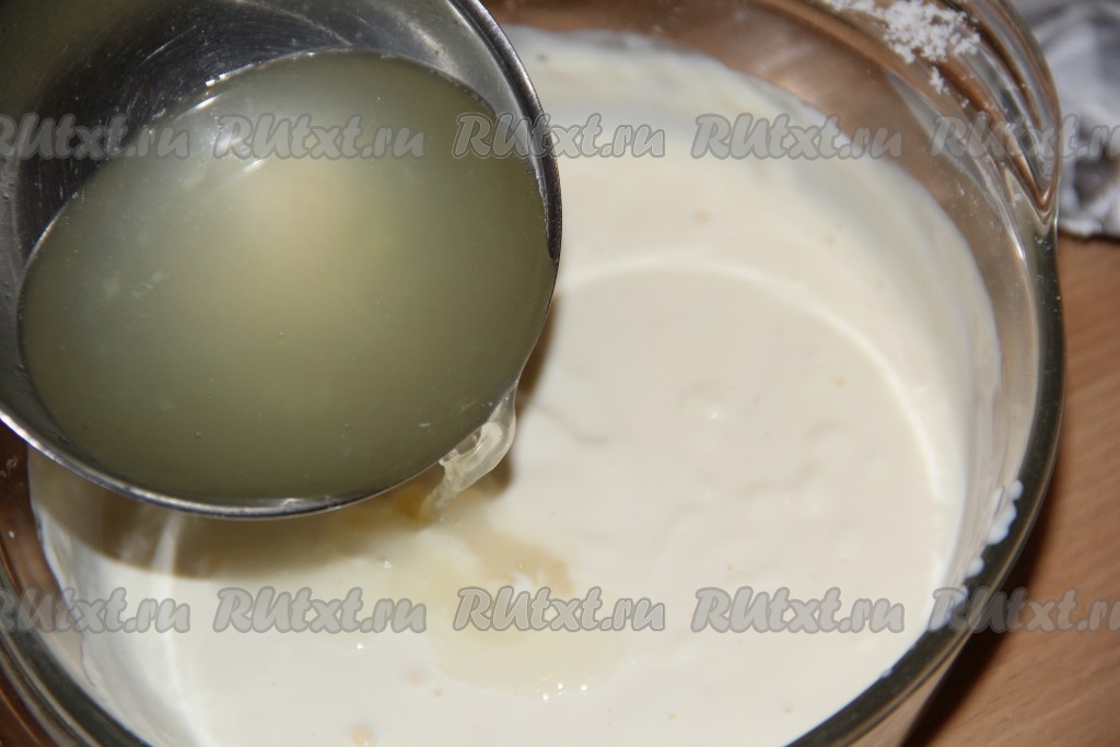 Влить пару половников горячего бульона в сметанную массу и перемешать.