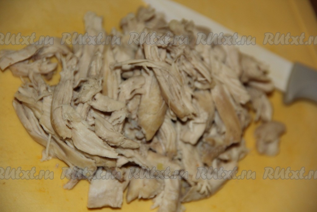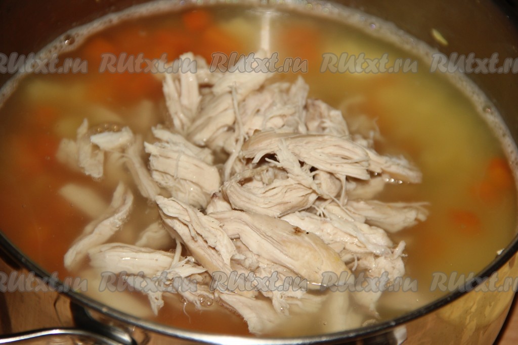 Снять кастрюлю с огня, слить бульон в другую кастрюлю. Филе немного остудить (если вы варите суп не с филе, а с другими частями курицы, то отделите мясо от костей) и порвать на волокна (или нарезать).
