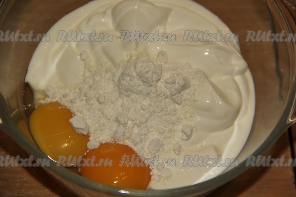 В тарелке соединить сметану, сырые яичные желтки и муку.