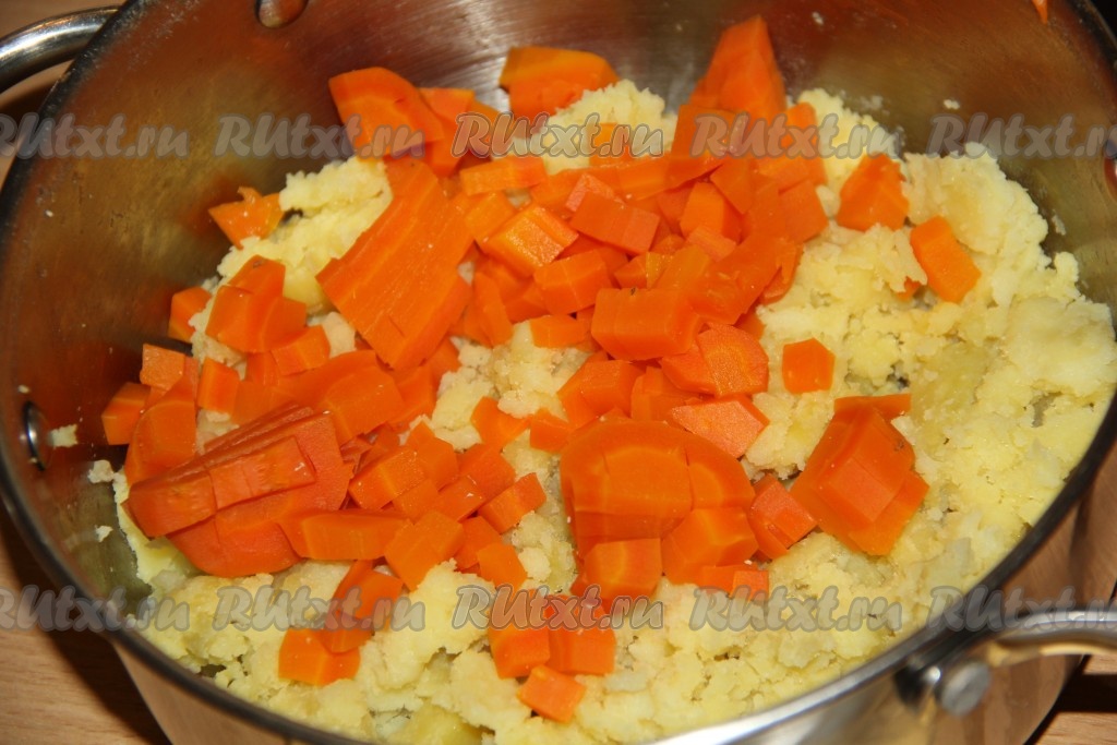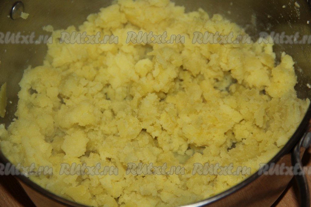 Варёный картофель размять толкушкой и выложить в кастрюлю.