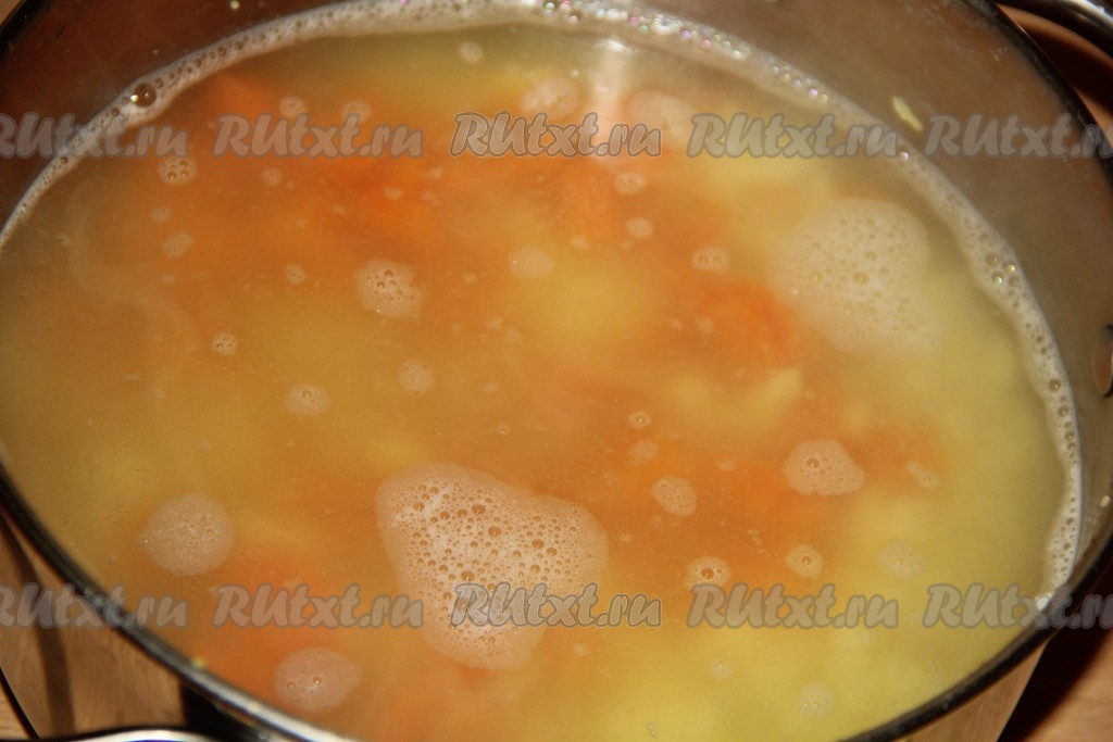 Залить картофель и морковь бульоном, поставить кастрюлю на огонь.
