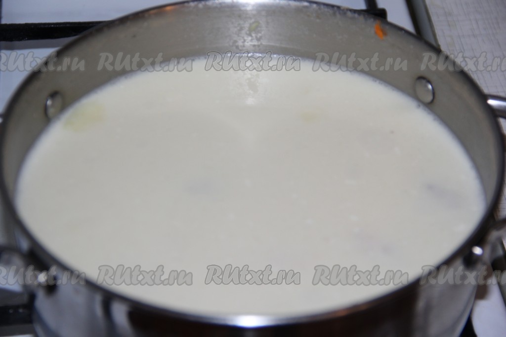 Получившуюся смесь постепенно вылить в кастрюлю, помешивая, затем довести куриный суп на небольшом огне до кипения, посолить, добавить специи по вкусу. Снять кастрюлю с огня.