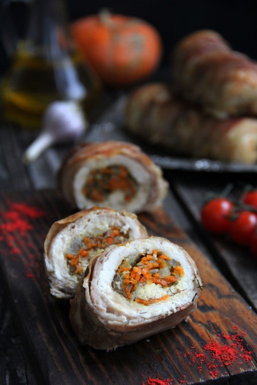 Приготовить по этому рецепту куриные рулетики с начинкой в духовке совсем несложно. Выглядит блюдо очень красиво, да и получается вкусным, сочным и нежным. В роли начинки будем использовать морковь, лук и зелень, а каждый куриный рулетик дополнительно завернём в ломтики бекона. Такие рулеты можно приготовить не только для домашнего ужина, но и на праздничный стол. К этому мясному блюду можно подать любой гарнир: макароны, картошку или нарезку из свежих овощей.