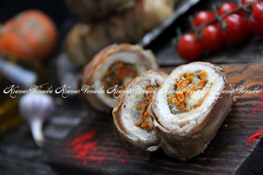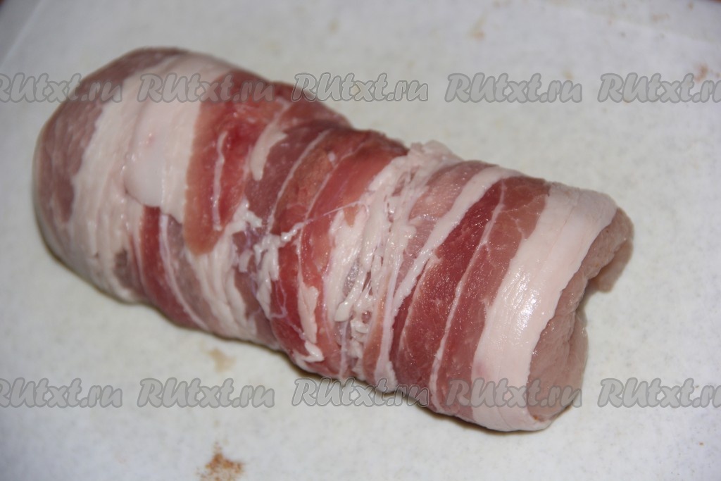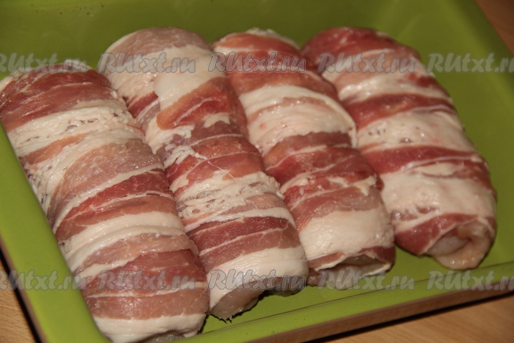 Сверху куриный рулет обмотать полосками бекона. Таким же образом сформировать ещё 3 куриных рулетика с начинкой в беконе.