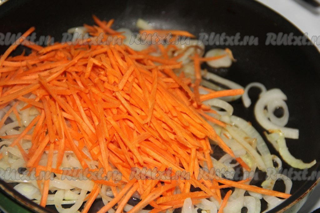 Морковь натереть на специальной тёрке для моркови по-корейски. Если нет такой тёрки, то натрите на крупной тёрке. Добавить морковь в сковороду к луку и обжарить в течение 5 минут на среднем огне, не забывая перемешивать время от времени.