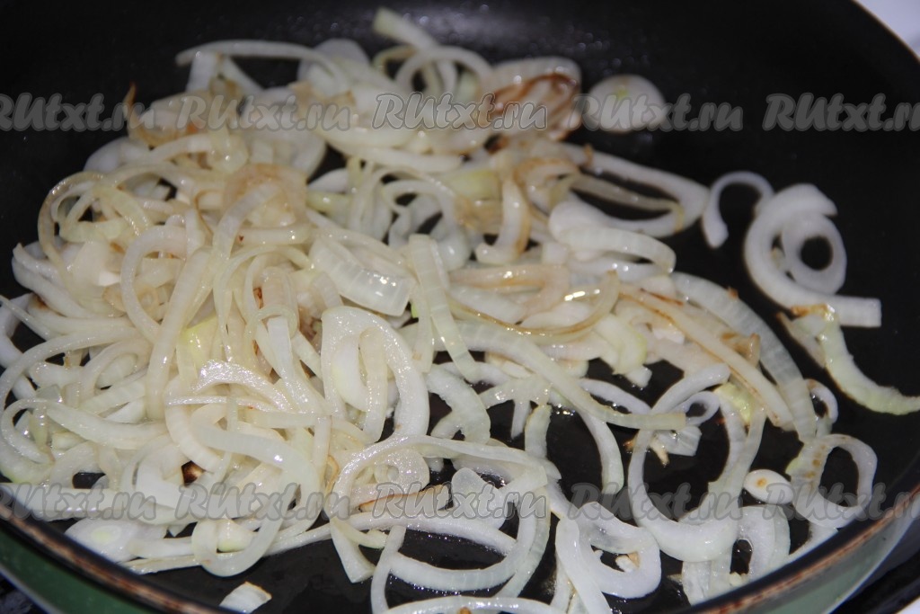 Для приготовления начинки лук, чеснок и морковь очистить. Нарезать лук на тонкие полукольца. В сковороду влить растительное масло, выложить лук и обжарить его в течение 3 минут, иногда помешивая, на среднем огне.