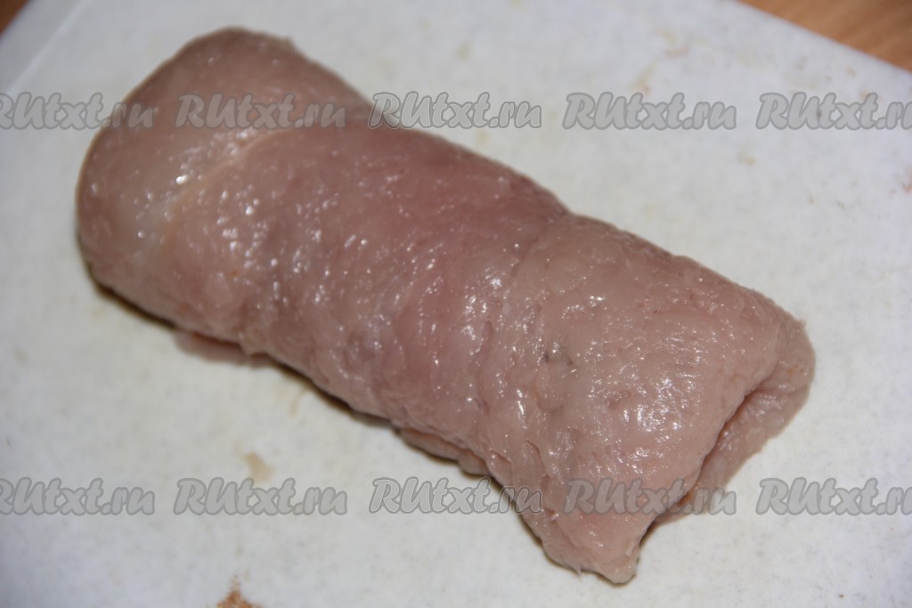 Подвернуть края мяса с двух сторон, а затем свернуть филе в рулет (начинка должна быть полностью закрыта).