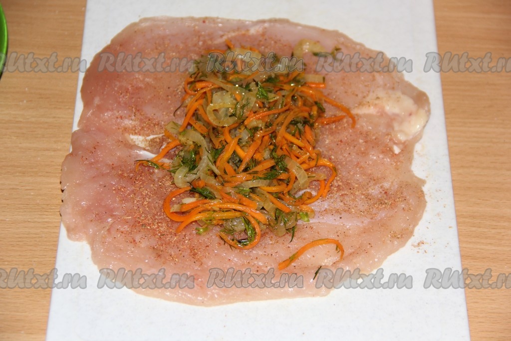 Выложить часть начинки в центр отбитого пласта куриного филе.