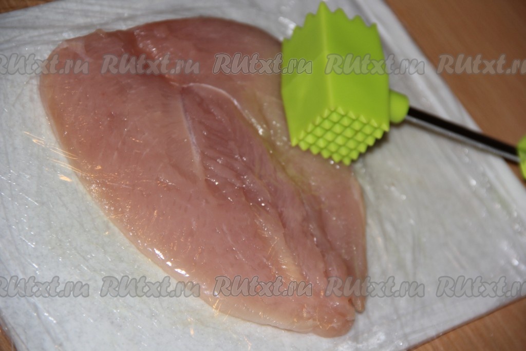 Куриное филе разрезать, как книгу (как на фото), и отбить.