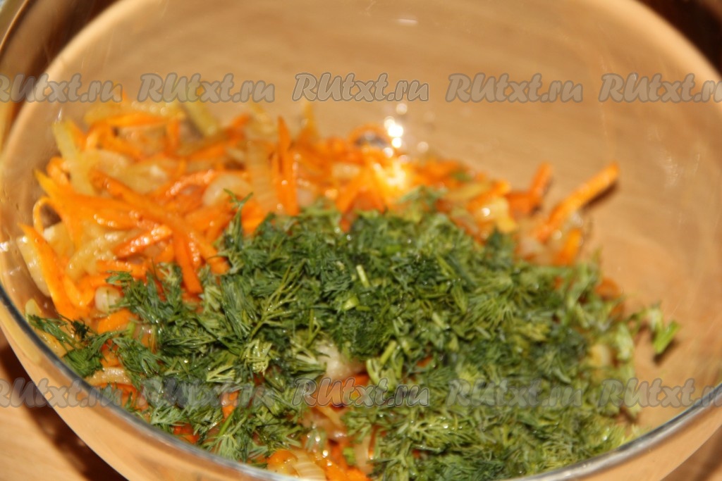 Укроп вымыть, мелко нарезать и выложить к моркови с луком и чесноком, посолить по вкусу, перемешать и начинка для куриных рулетиков готова.