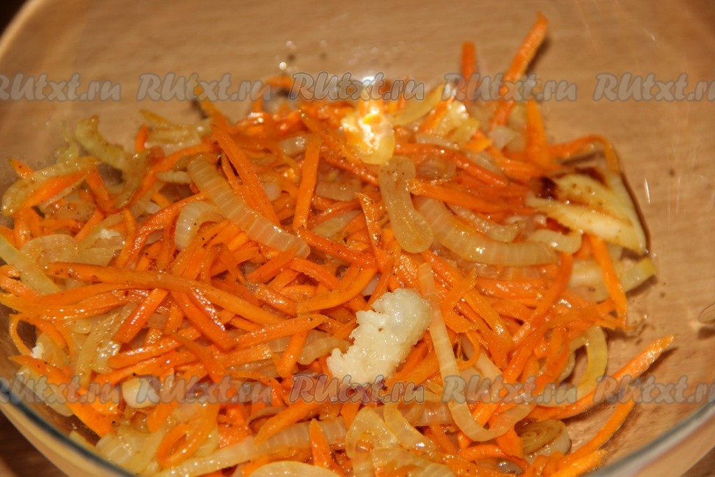 Выложить обжаренные овощи в тарелку, дать немного остыть, затем добавить чеснок, пропущенный через пресс.