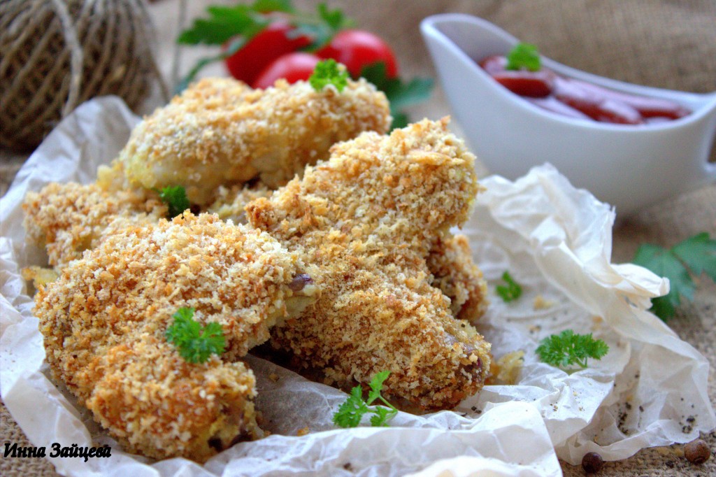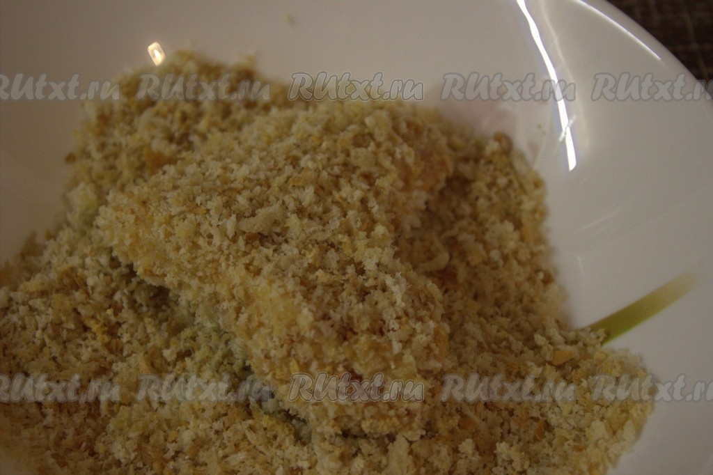 Затем куриные крылышки хорошо обвалять со всех сторон в панировочных сухарях.