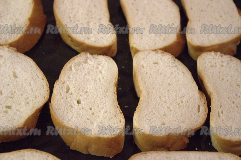 В качестве панировки для куриных крылышек можно взять покупные панировочные сухари, а можно, как это сделала я, приготовить панировочные сухари в домашних условиях. Для приготовления сухарей нужно батон нарезать на ломтики толщиной 1 сантиметр, выложить на сухой противень и подсушить в духовке, заранее разогретой до 180 градусов, 8-10 минут (до зарумянивая).