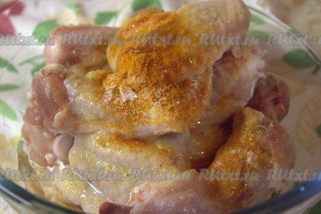 Выложить куриные крылышки в миску, посолить, посыпать специями, влить 2 столовые ложки растительного масла, перемешать и оставить мариноваться на 30 минут при комнатной температуре (если позволяет время, можно оставить мариноваться и на более длительное время).