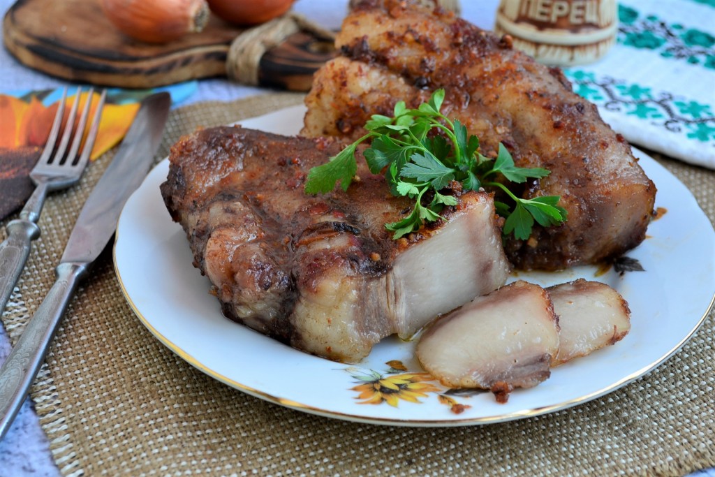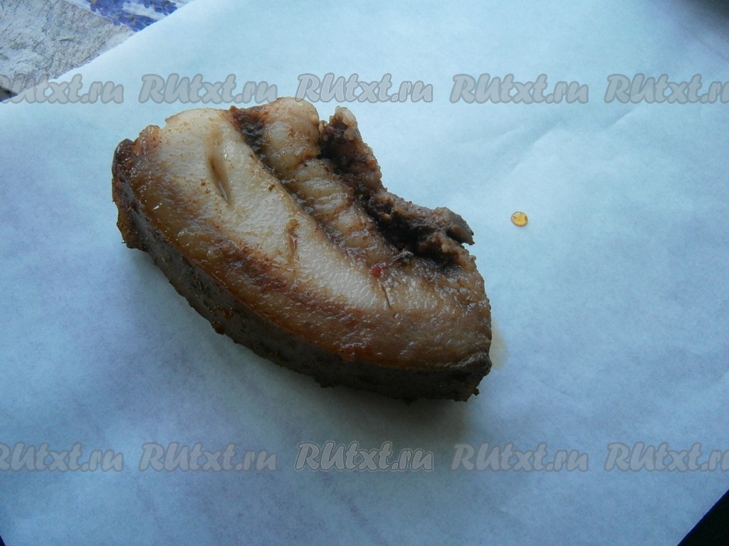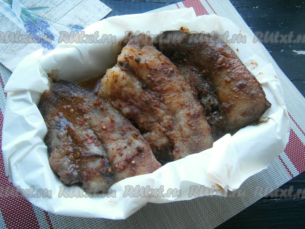 По прошествии суток щековину выложить в форму для запекания, застеленную пергаментом, так, чтобы куски сала лежали плотно друг к другу.