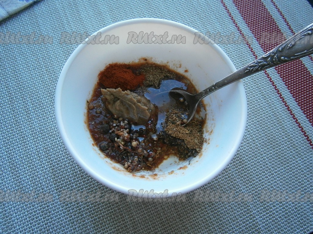 К аджике и соевому соусу добавить горчицу, паприку, приправу, сухую аджику, всыпать кориандр, соль.