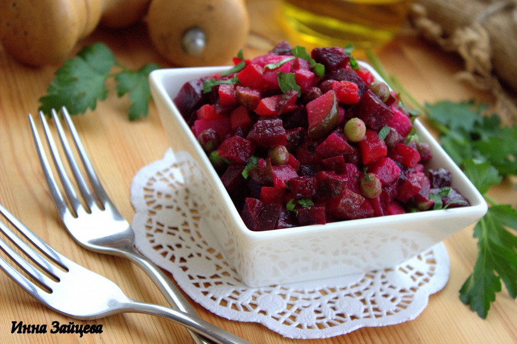 Очень вкусный, яркий и аппетитный винегрет из запечённых овощей подавать в качестве самостоятельного блюда или в качестве дополнения к мясу. Особенно хорошо салат, приготовленный по этому рецепту, сочетается с котлетками.