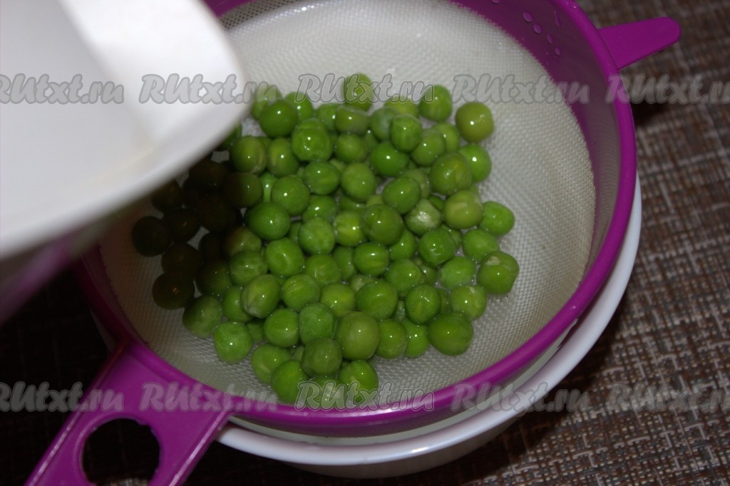 Замороженный горошек поместить в сито, обдать кипятком (если используете консервированный горошек, необходимо предварительно слить жидкость).