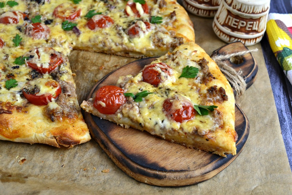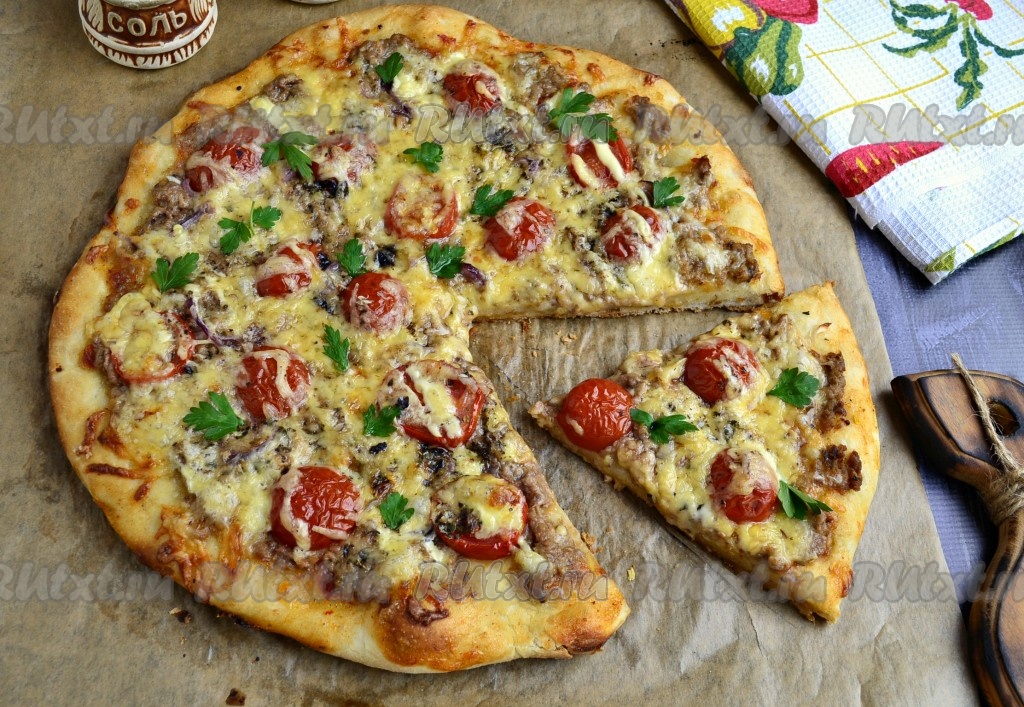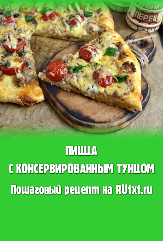 Ароматную, очень вкусную пиццу с консервированным тунцом нарезать на части и подать в горячем виде.