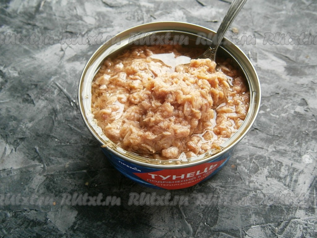 Для приготовления начинки открыть баночку с консервированным тунцом (у меня тунец измельчённый).