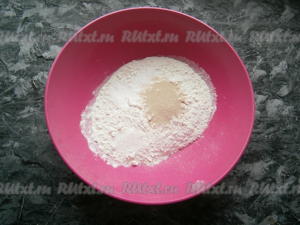 Для приготовления теста просеять в миску муку, добавить по щепотке соли и сахара, всыпать дрожжи, перемешать.