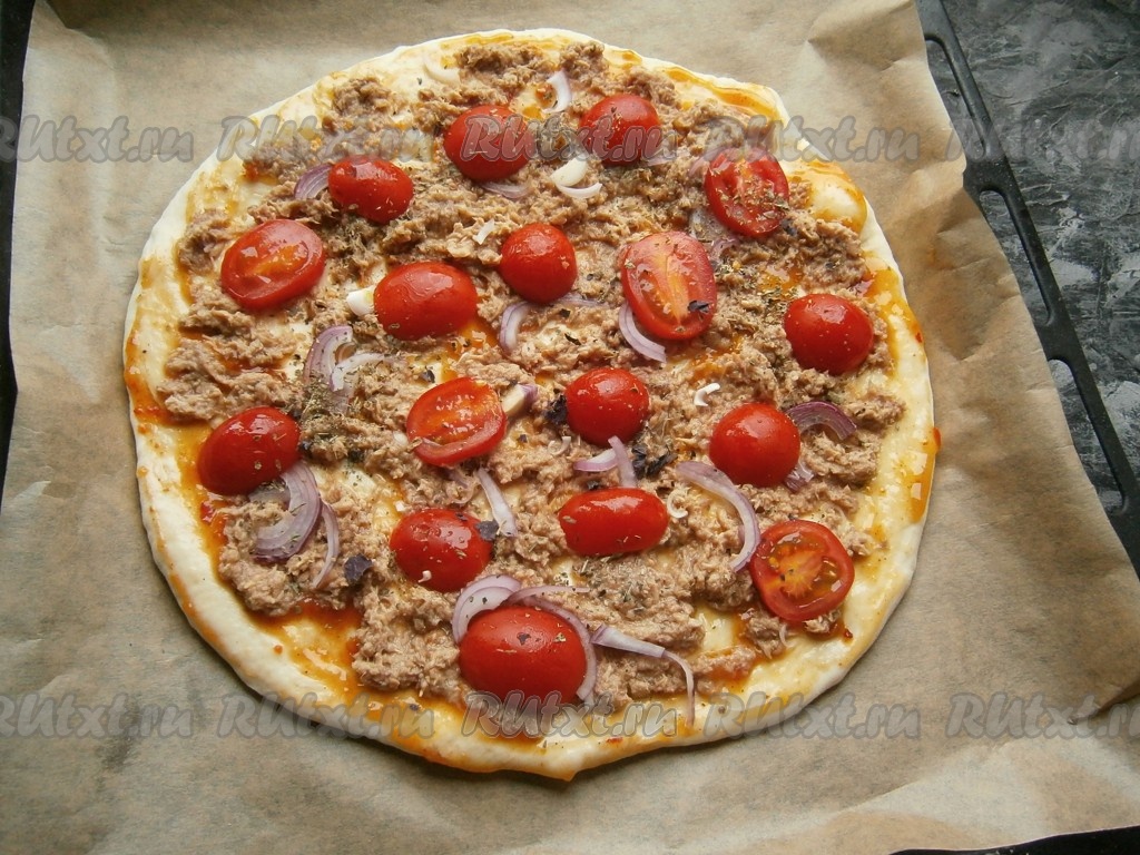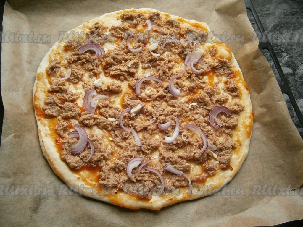 Далее на тесто выложить консервированного тунца и тонкие перья (или полуколечки) очищенного лука.