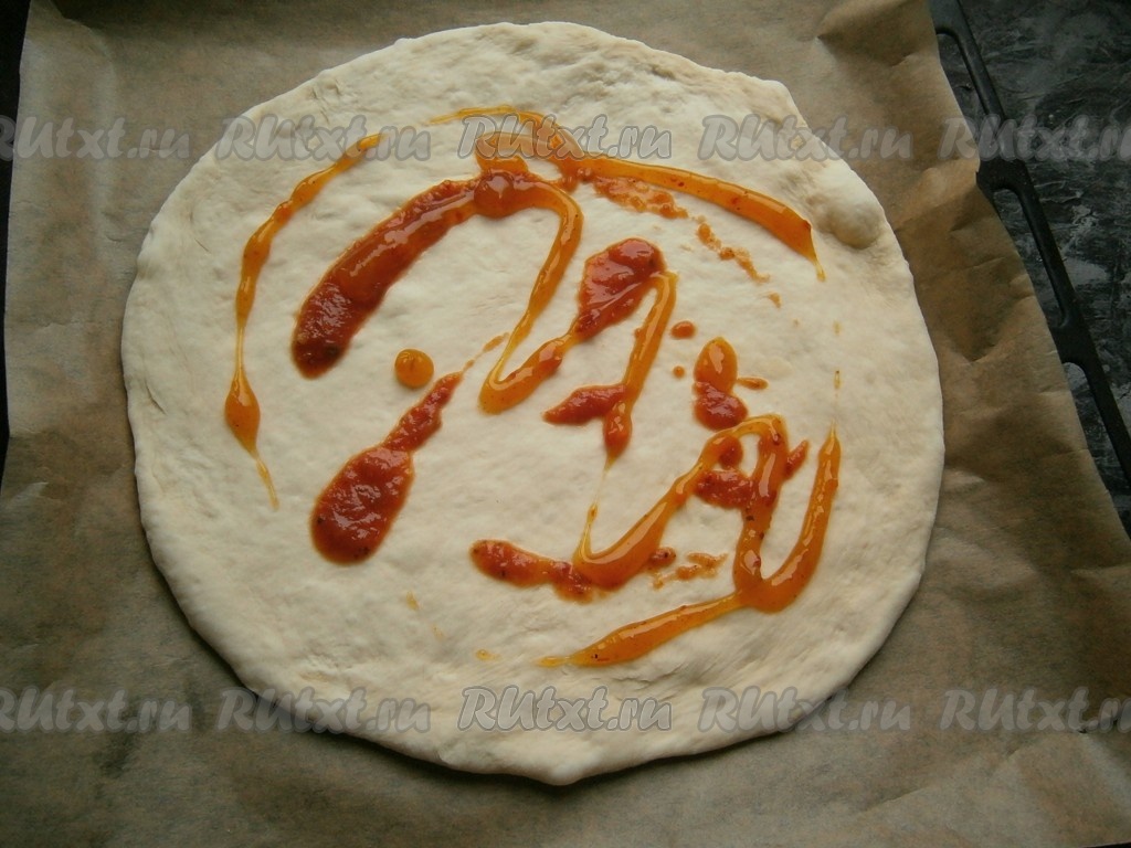Тесто раскатать в лепёшку толщиной около 0,5 см. Переложить раскатанное тесто на противень, застеленный пергаментом. Смазать тесто томатным соусом и соусом "Манго-чили" (если соуса "Манго-чили" нет, замените его томатным соусом или кетчупом).