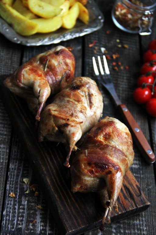 Перепелов готовлю не первый раз, запекала их на мангале и в духовке. Птички маленькие, поэтому ножки и крылья в процессе запекания начинают подгорать. Недавно приготовила перепелов в беконе в духовке и была удивлена. Птички получились очень вкусными, сочными. Бекон придал перепелам нежный вкус, не дал перепелиному мясу пересушиться и подгореть. Перепёлок решила нафаршировать начинкой из морковки с луком и шампиньонами, но можно обойтись и без начинки. Запекала перепелок на подложке из картофеля, так что сразу был готов и гарнир!