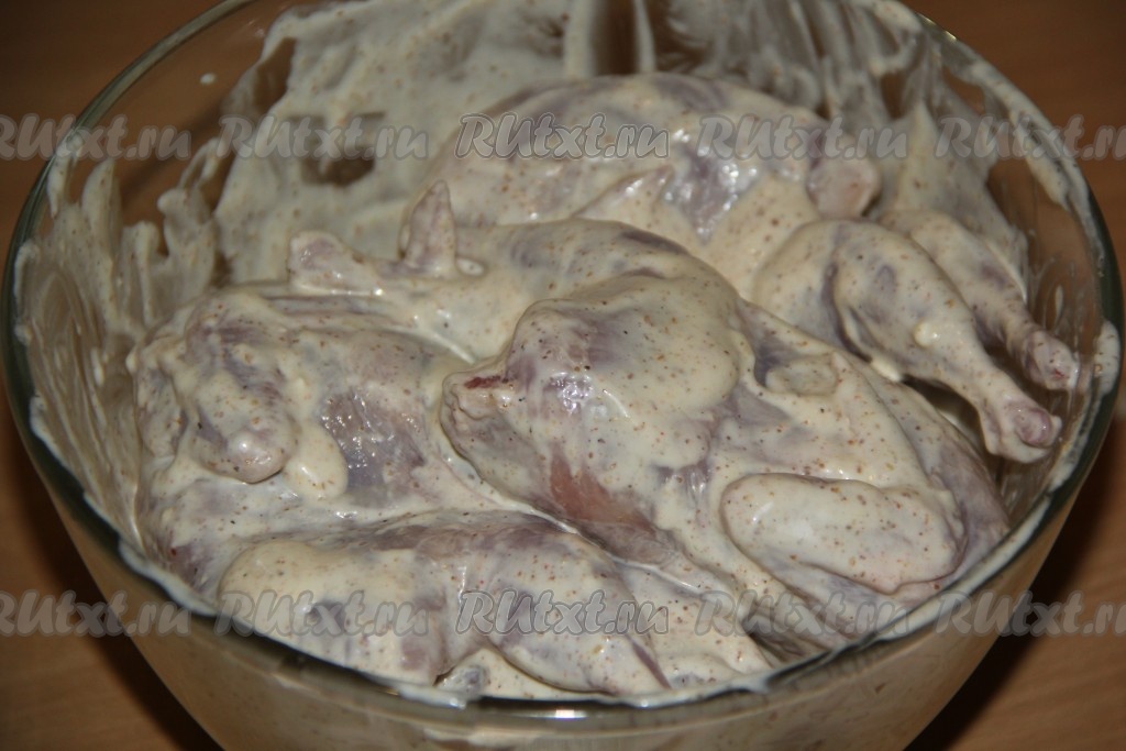 Перепелов вымыть и обсушить. Для приготовления маринада соединить в миске сметану, майонез, горчицу и сок лимона.
