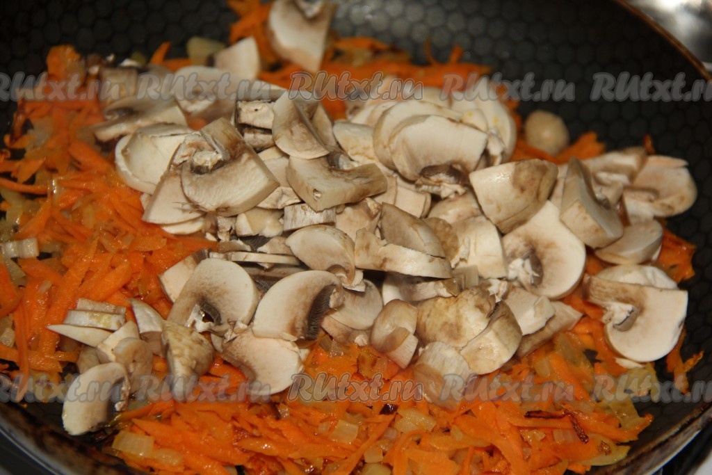 К обжаренным овощам добавить нарезанные пластинами шампиньоны, соль и специи по вкусу. Обжарить овощи с грибами минут 7, иногда перемешивая, затем снять начинку с огня и слегка остудить.