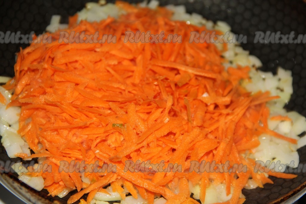 Морковь очистить, натереть на тёрке и выложить в сковороду с луком, обжарить минут 5, помешивая время от времени.