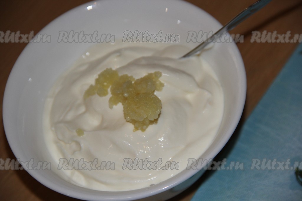 В небольшой ёмкости соединить сметану и пропущенный через пресс чеснок.