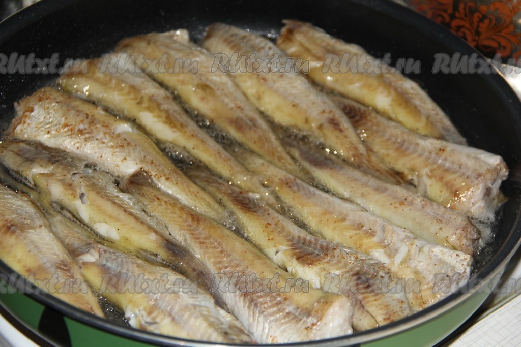 В сковороду влить немного растительного масла, разогреть. Выложить целого минтая (или кусочки) в сковороду в один слой.