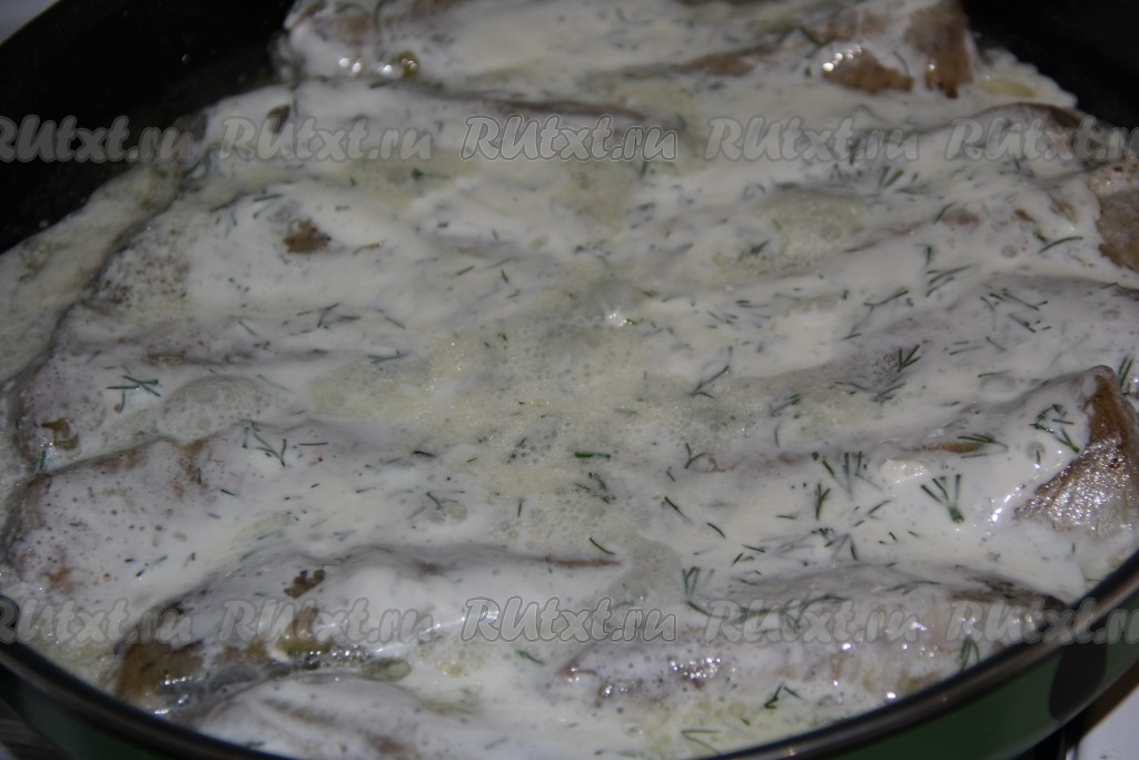 Жареного минтая равномерно полностью покрыть сверху смесью сметаны, чеснока и укропа, накрыть сковороду крышкой. Томить рыбу на медленном огне 10 минут.