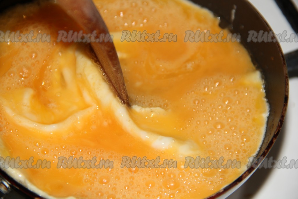 И как только яичница начнёт "схватываться", нужно с помощью лопатки аккуратно сдвигать "схватившуюся" яичную массу к середине сковороды.