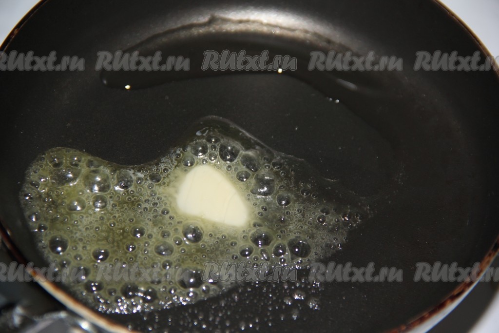 Сливочное масло растопить на сковороде. Я делала яичницу на маленькой сковороде диаметром 15 см. Если делать на сковороде диаметром больше, то просто увеличьте количество продуктов вдвое.