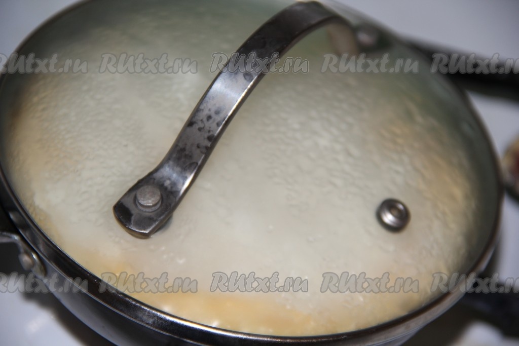 Накрыть сковороду крышкой и готовить на медленном огне, примерно, 5 минут.