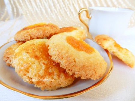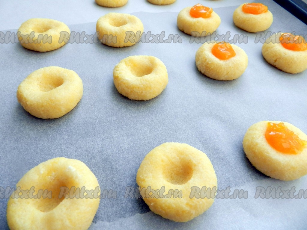 Аппетитное, вкусное, нежное песочное печенье достать из духовки, дать остыть и можно подавать к столу. Благодаря тому, что джем находится сверху, выпечка получается особенно аппетитной. Приготовьте рассыпчатое, тающее во рту печенье и оно станет прекрасным дополнением к чашечке чая или кофе.
