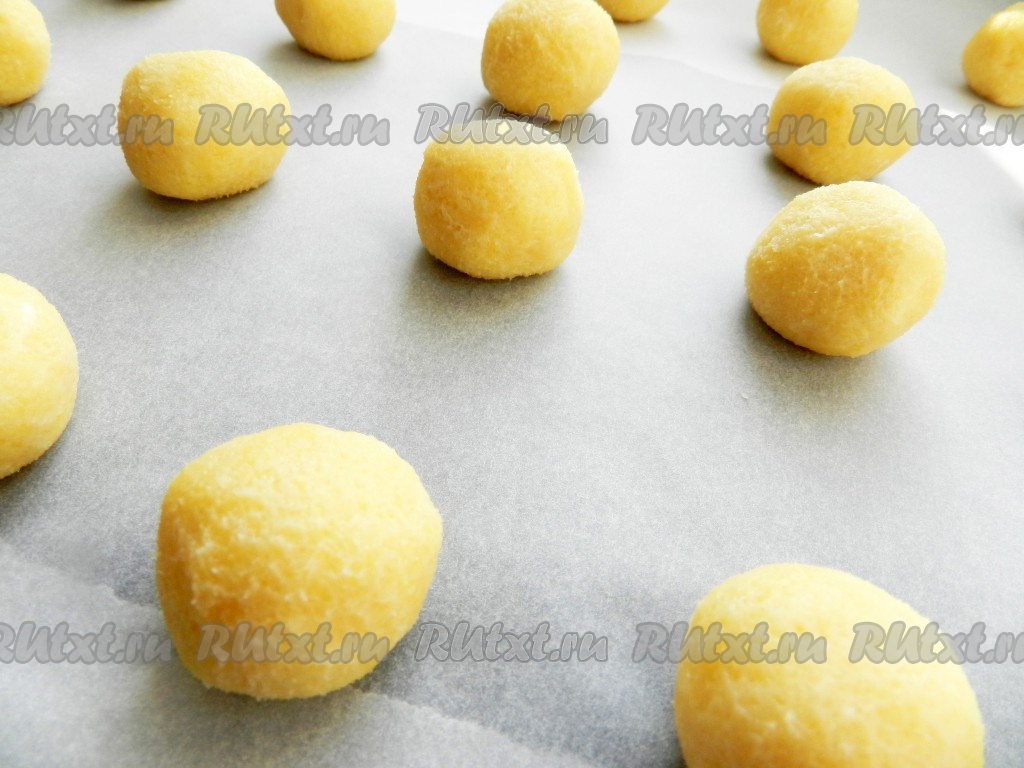 Противень застелить бумагой для выпечки. Из теста скатывать шарики размером с грецкий орех и выкладывать их на противень на расстоянии друг от друга (обычно получается 18-20 шариков).