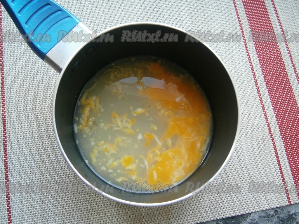 Для приготовления лимонного крема нужно хорошо вымыть лимон, ошпарить его кипятком, снять с него цедру, выдавить сок. Сока нам понадобится 60 мл, если у вас получится меньше, долейте простую воду до нужного количества. Лимонный сок, цедру, сахар и сырые куриные желтки поместить в ковшик (или кастрюльку).